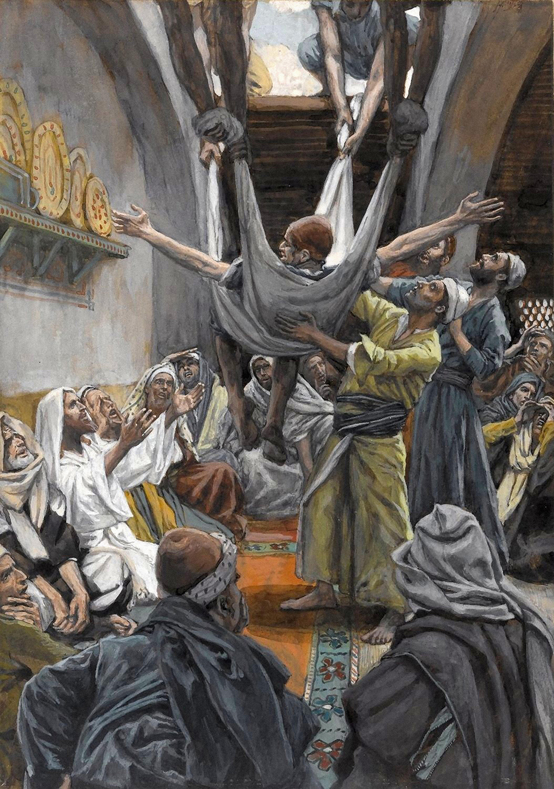 »Als er nach Tagen abermals nach Kafarnaum kam, wurde gehört, er sei im Haus. Und viele liefen zusammen, sodass auch im Torhof kein Platz mehr war. Während er das Wort zu ihnen redete, kommen sie und bringen einen Gelähmten zu ihm, von vier Männern getragen. Weil sie ihn wegen der Leute nicht zu ihm hinbringen konnten, deckten sie dort, wo er war, das Dach ab und gruben ein Loch hindurch. So lassen sie die Bahre, auf der der Gelähmte lag, hinunter. Als Jesus ihren Glauben sieht, sagt er zum Gelähmten: Kind, jetzt sind deine Sünden nachgelassen.